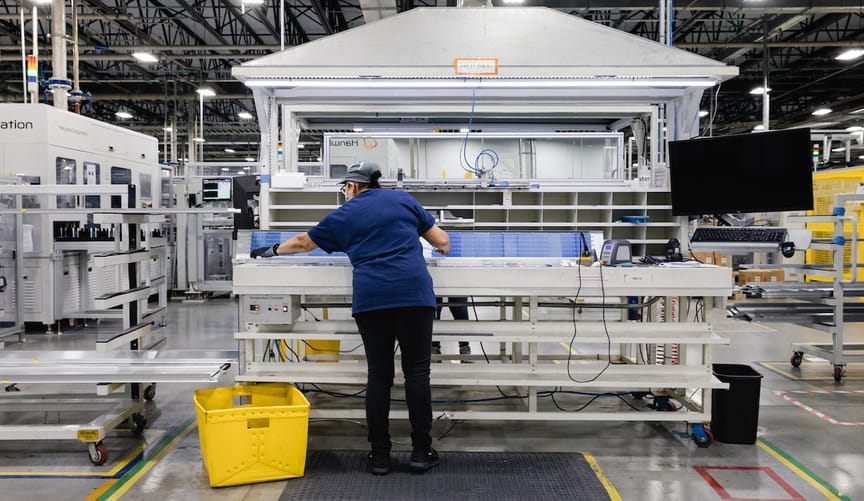An employee performs quality control on the assembly floor at the Qcells solar panel manufacturing facility in Georgia. (Dustin Chambers for The Washington Post via Getty Images)
