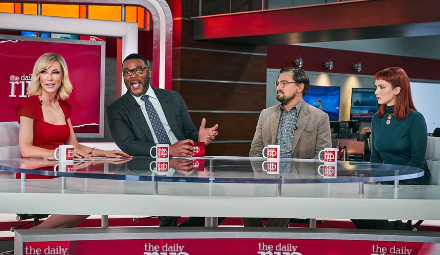Cate Blanchett, Tyler Perry, Leonardo DiCaprio and Jennifer Lawrence in Don’t Look Up. (Netflix)