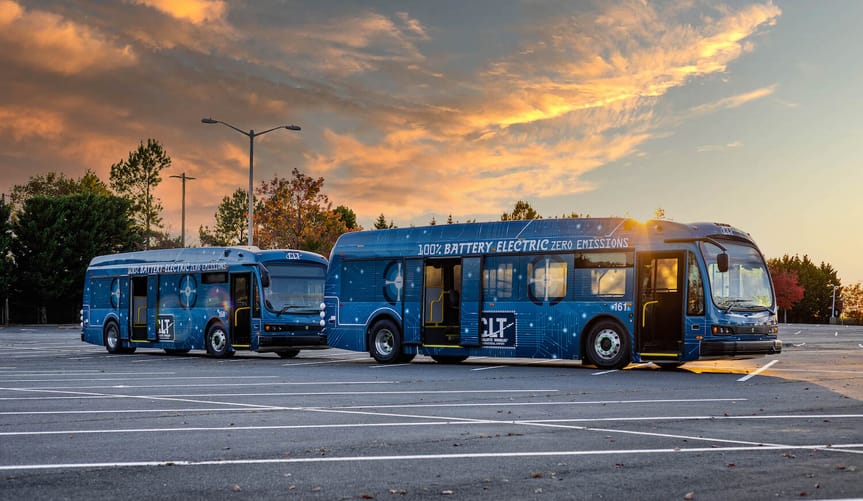 Battery-powered buses carry passengers from parking lots to airport terminals in Charlotte, North Carolina. (Charlotte Douglas International Airport)