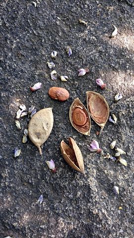 English: Picture of Pongamia flowers, pods and seeds over a rock. |