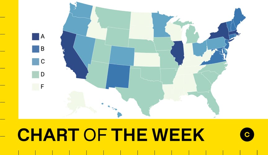 The Institute for Local Self-Reliance has assigned each state a community power score from A to F based on whether it has 10 different kinds of policies that support local clean energy. The scorecard gives the greatest weight to four types of policies: community choice aggregation, shared renewables, net metering, and carve-outs for distributed energy and solar in renewable portfolio standards. States get points docked if they have passed laws prohibiting cities and counties from banning gas hookups in new construction, as 20 states have done.