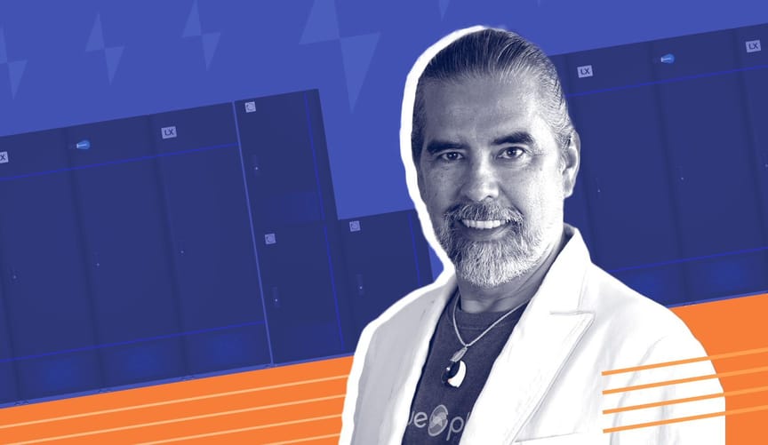 A smiling man with salt and pepper hair in a ponytail and a beard sits next to a large technological device