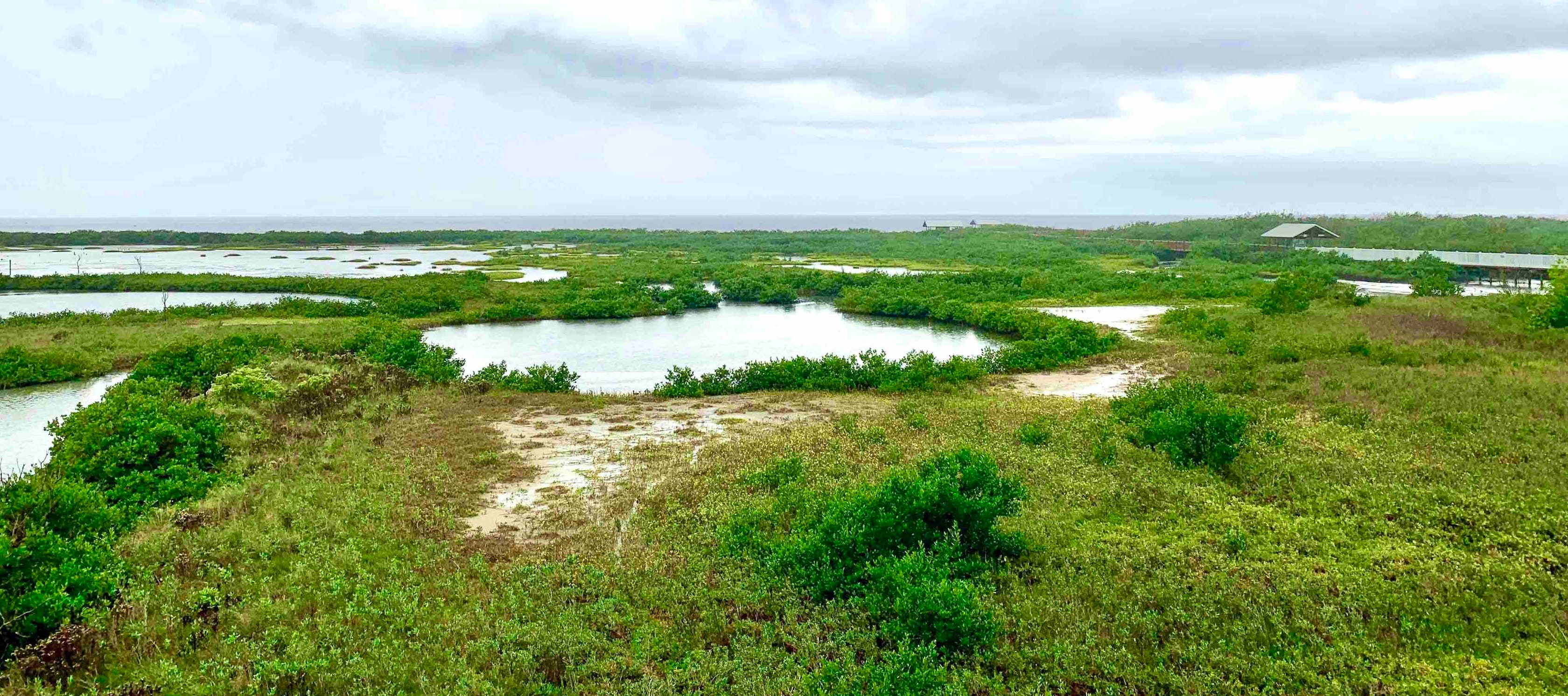 White and brown birds perch among the mangroves. The Gulf Coast ecosystem in South Texas provides critical habitat for many waterfowl and migratory birds, as well as endangered species such as ocelots and green sea turtles.